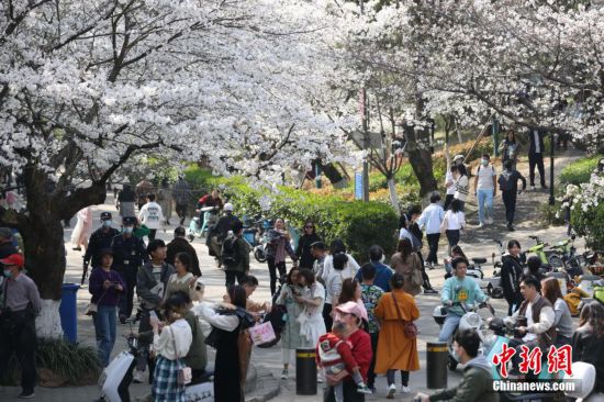 原标题:武汉大学对社会公众开放赏樱首日 樱花树下人潮涌