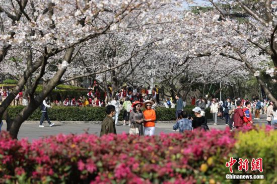 原标题:武汉大学对社会公众开放赏樱首日 樱花树下人潮涌