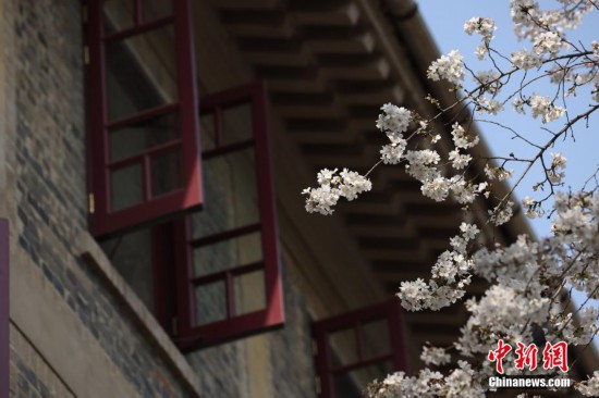 白色樱花与朱红色窗棂相呼应。