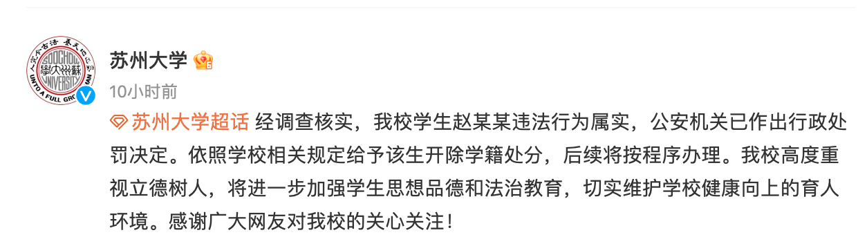 苏州大学在回应中表示,学校高度重视立德树人,将进一步加强学生思想品德和法治教育,切实维护学校健康向上的育人环境。