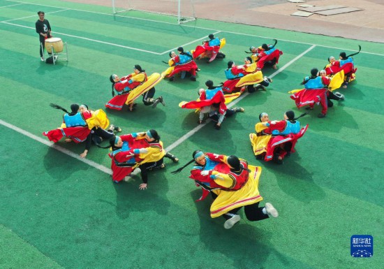 3月20日,隆化县职教中心学生在练习国家级非遗项目“二贵摔跤”(无人机照片)。