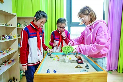 浙江省宁波市江北区洪塘实验学校的心理教师在心理辅导室和学生一起摆放沙盘。新华社发