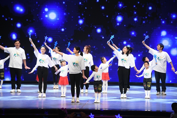 在爱与力量的凝聚下,现场嘉宾上台为星星的孩子送上祝福并点亮蓝灯。在这片蓝色的海洋中,在场全体人员共同表达心声,喊出口号:“手拉手,心连心,我们在一起,一个不能少!”