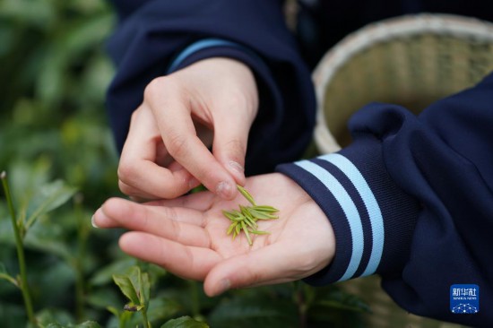 3月29日,紫阳县职业教育中心茶叶专业的学生在该县洄水镇茶稻村采茶。