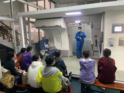 航空企业在实训基地组织实施空乘专业教师培训项目,此为参训教师学习正常与紧急情况开关舱门的要领、机上应急设备