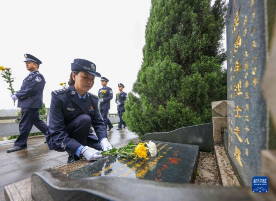 4月5日,成都铁路公安局贵阳公安处铜仁南车站派出所民警在小凤山烈士陵园向烈士墓敬献鲜花。