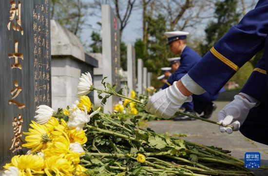 4月3日,消防救援队员在贵州省黔东南苗族侗族自治州丹寨县烈士陵园给烈士墓献花。