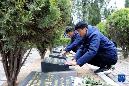 4月3日,在山东省青岛西海岸新区烈士陵园,青年志愿者在擦拭英烈墓碑。