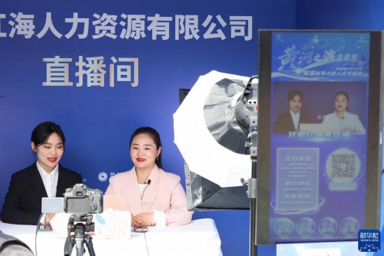 4月8日,主播在兰州市春季人才交流会现场进行直播带岗。
