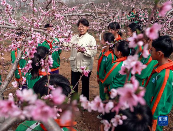 4月10日,技术人员在桃树果园向河北省遵化市东旧寨镇梁屯中心小学的学生介绍桃树生长知识。
