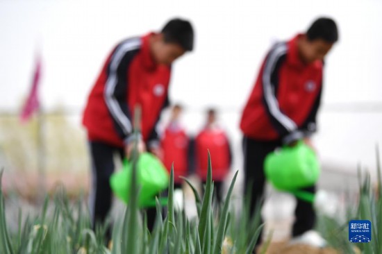 4月10日,学生在河北省张家口市怀来县桑园中学劳动实践基地里体验农耕。