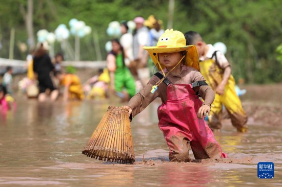 4月10日,四川省广安市武胜县东方红幼儿园的小朋友在龙女镇的稻田里抓鱼。