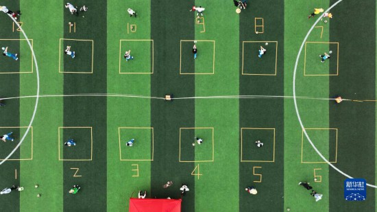 4月13日,在贵州省锦屏县第四中学,考生参加排球测试(无人机照片)。