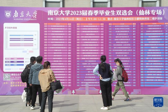 当日,南京大学2023届毕业生春季双选会在南京大学仙林校区举办。双选会面向校内外学生开放,吸引了来自北京、上海、南京等地的180家企事业单位参会,提供近1.5万个岗位。