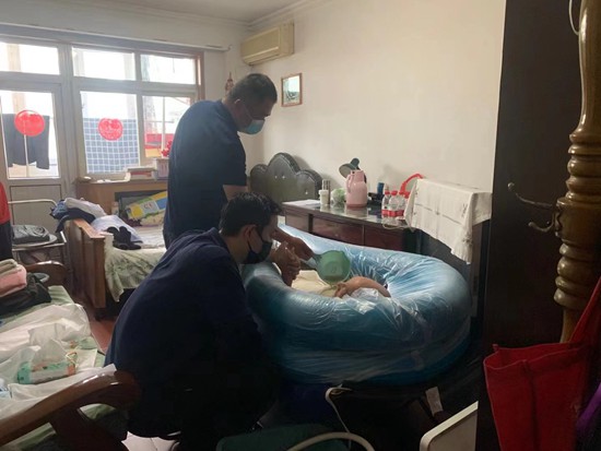 3月11日,助浴团队在北京察慈小区为一名101岁的老人提供助浴服务。受访者提供