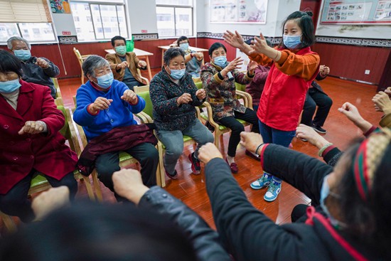 江苏省盐城市亭湖区大洋街道综合养老服务中心,工作人员在带领老人练习手指操。新华社记者 李博/摄