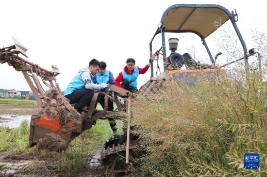 4月29日,在衡阳县西渡镇新桥村,南华大学的大学生志愿者在检修农机。