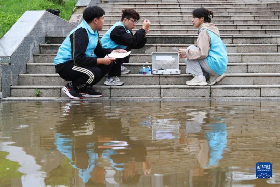 4月29日,在衡阳县西渡镇新桥村,南华大学的大学生志愿者在检测水质。
