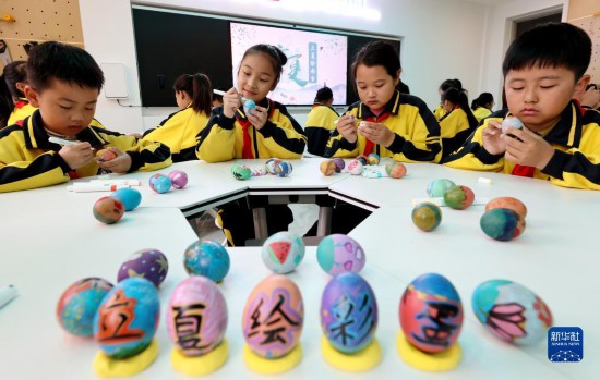 5月5日,在山东省枣庄市东湖小学,学生们在绘制彩蛋。