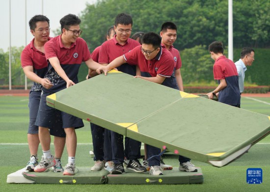 5月14日,在重庆市北碚区朝阳中学,高三学生参加“搭桥过河”趣味游戏。