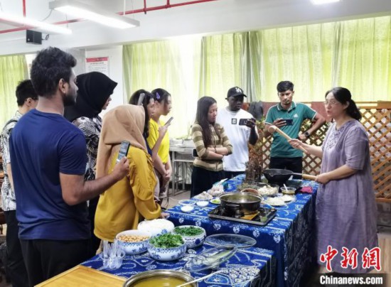 在活动现场,中国老师演示油茶制作,留学生们将操作台围了起来。来自喀麦隆的留学生李昆泽第一次尝试打油茶,他对此感到很新奇。“油茶的做法很特别,制作完后还可以根据自己的口味添加各种佐料,风味独特,我喜欢。”李昆泽说。