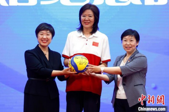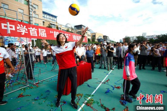 图为郎平为陈经纶中学首届“郎平杯”排球联赛开球。 中新社记者 富田 摄