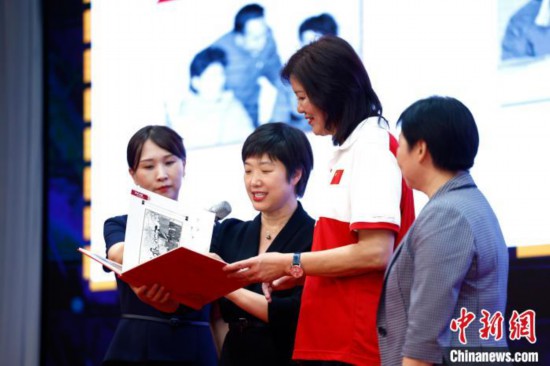 图为陈经纶中学向郎平赠送纪念品。 中新社记者 富田 摄