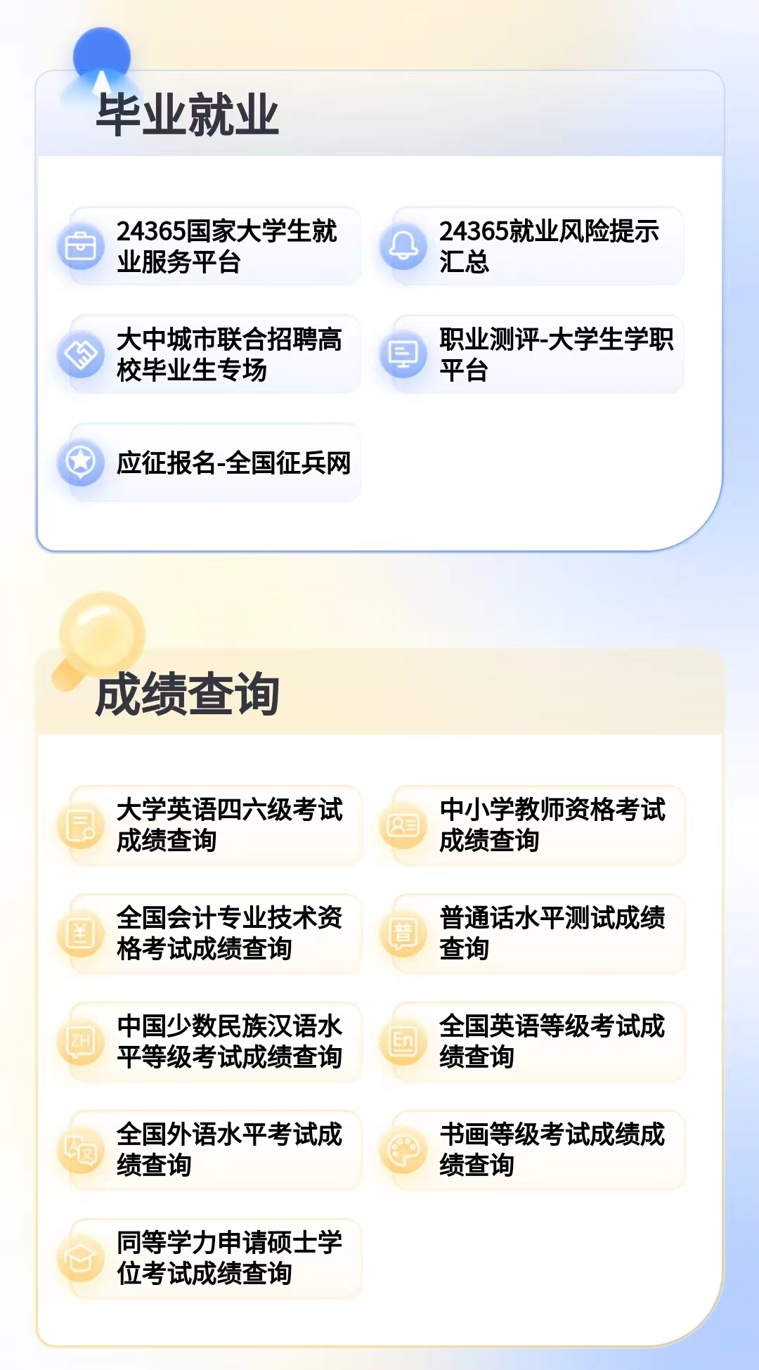细分到大学生群体,“好博体育+”客户端便民服务汇总小程序提供在校期间多种国家考试成绩的查询服务,并为大学生群体提供毕业就业资讯及服务,实现从入学到就业“服务闭环”: