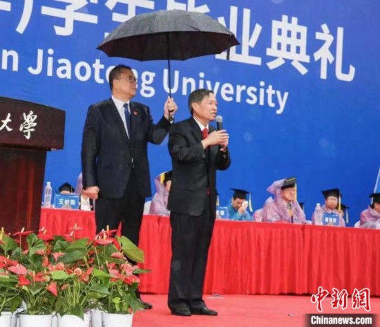 图为西安交通大学毕业典礼当日,该校党委书记卢建军为校长王树国撑伞。 西安交通大学供图
