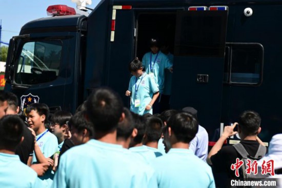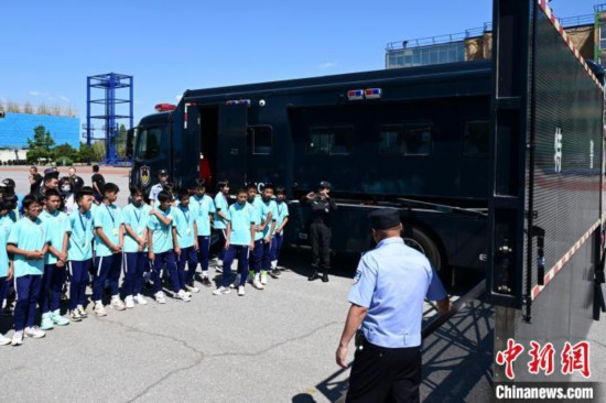 由北京市公安局支教民警组建并执教的贵州黔西南州青少年校园足球男、女队员共34人来到北京参加夏令营活动。今天,队员们观看特警训练及警犬演示,现场体验警械武器和警车等装备使用,感受首都公安风采。