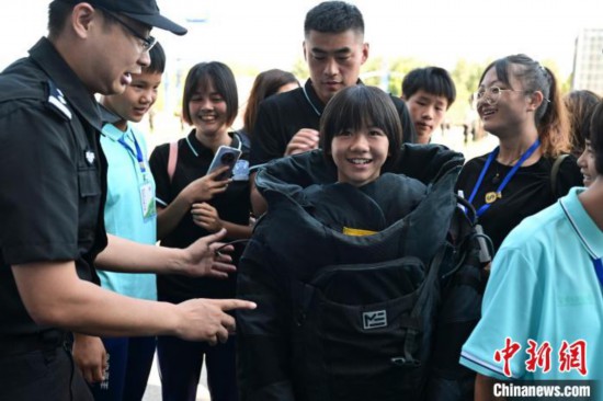 7月9日,队员们观看特警训练及警犬演示,现场体验警械武器和警车等装备使用,民警讲解安全防范知识。