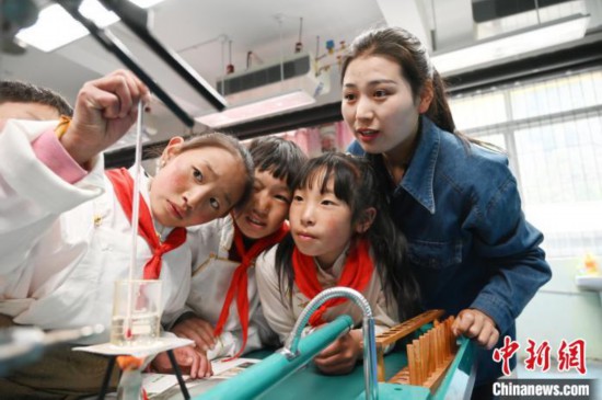 5月18日,四川阿坝州壤塘县寄宿制学校学生在科学课做实验。 中新社记者 安源 摄