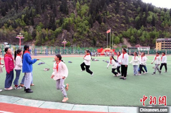5月17日,四川阿坝州壤塘县寄宿制学校的学生在操场跳绳。 中新社记者 安源 摄