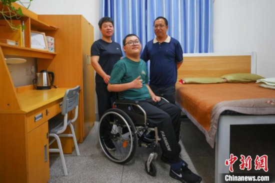 来自江苏启东的董亦超前来东南大学报到,坐在轮椅上的他在父母的陪同下入住宿舍。泱波 摄