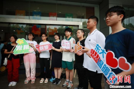 东南大学迎来4117名本科新生,在设立的绿色通道处,师生们合影。泱波 摄