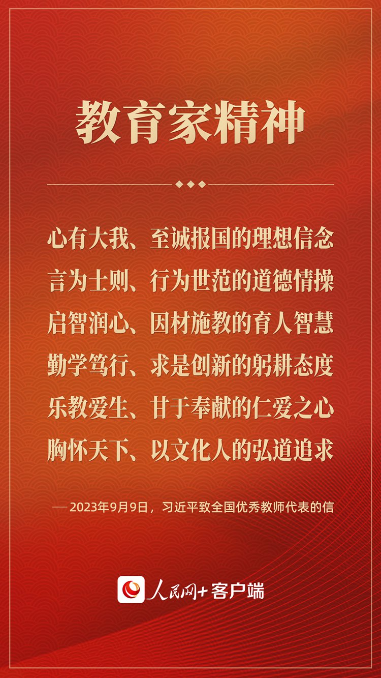 习近平在信中首次提出并深刻阐释了中国特有的教育家精神的时代内涵,即“心有大我、至诚报国的理想信念,言为士则、行为世范的道德情操,启智润心、因材施教的育人智慧,勤学笃行、求是创新的躬耕态度,乐教爱生、甘于奉献的仁爱之心,胸怀天下、以文化人的弘道追求”。