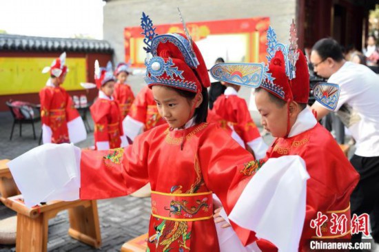 一场富有中华传统文化特色的“开笔礼”12日在山西太原百年唱经楼内举行,数十名小学生身着状元服,“沉浸式”体验古代学子的“开学典礼”。图为小学生进行“正衣冠”礼仪。中新社记者韦亮 摄