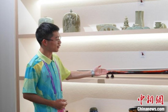 来自浙江外国语学院的“小青荷”王浩杰是媒体村文化屋的一名文化艺术助理,他主要负责向外国媒体记者介绍中国非遗文化,使其能够充分感受中国文化的魅力。