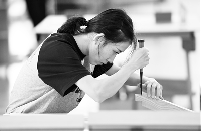 第二届职业技能大赛选手正在进行木工项目比赛。新华社记者 赵子硕摄