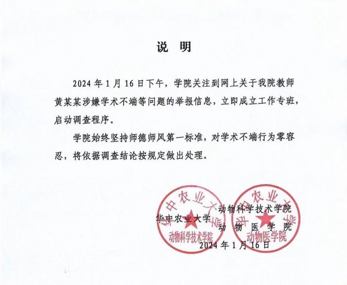 好博体育北京1月17日电 (记者李依环)据华中农业大学消息,近日,有学生实名举报该校某导师学术造假。16日晚,该校动物科学技术学院发布通报称,学院关注到网上关于教师黄某某涉嫌学术不端等问题的举报信息,立即成立工作专班,启动调查程序。
