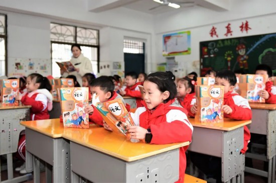 2023年2月7日,湖南省郴州市第十二完全小学,老师领读新学期第一课。通讯员 曹高林 摄