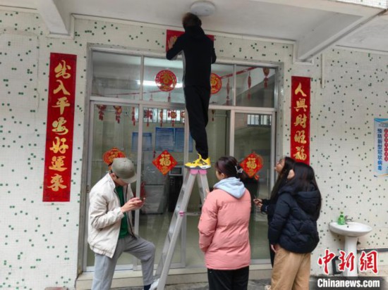 “这个‘福’字还要再贴高一点,再往左一点。”来自印度尼西亚的留学生周丽红对正在餐厅大门上贴“福”字的蒙古留学生李察说。