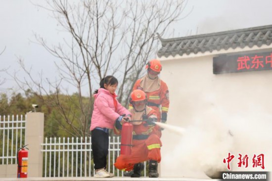 图为消防员为师生讲解手提式干粉灭火器的使用原理,并设置“火灾”场景,组织师生实操体验。 王治康 摄