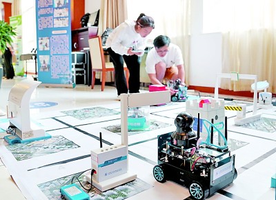 上海电子信息职业技术学院的师生展示智能机器人创新开发项目。 新华社发
