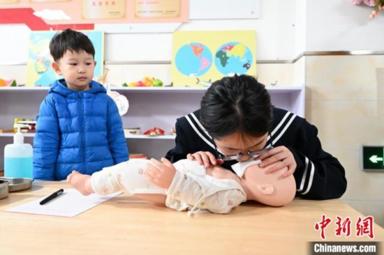 内蒙古呼和浩特市,幼儿保育专业学生展示海姆立克急救法。中新网记者 刘文华 摄