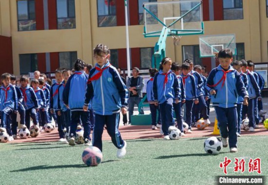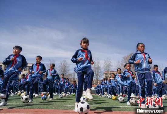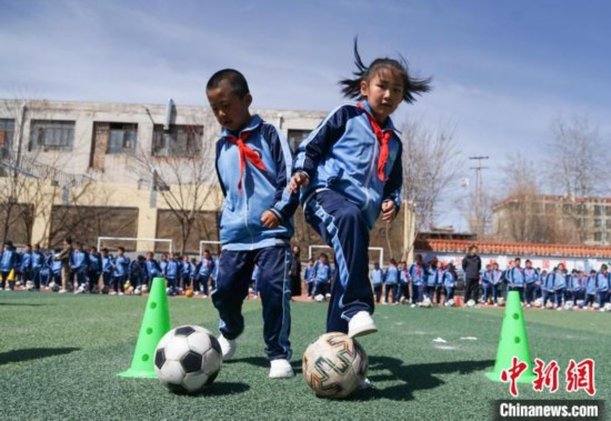 图为在西宁市大堡子小学,学生进行足球特色大课间展示。马铭言 摄