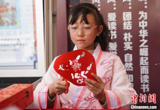 图为在西宁市大堡子小学,学生正在裁剪融入足球文化的剪纸作品。马铭言 摄