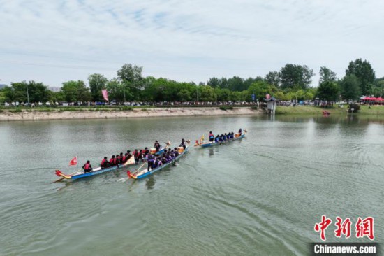 5月2日,来自长三角地区的12所高校的龙舟队齐聚安徽肥西,展开了一场龙舟竞技。(无人机照片)陈家乐摄