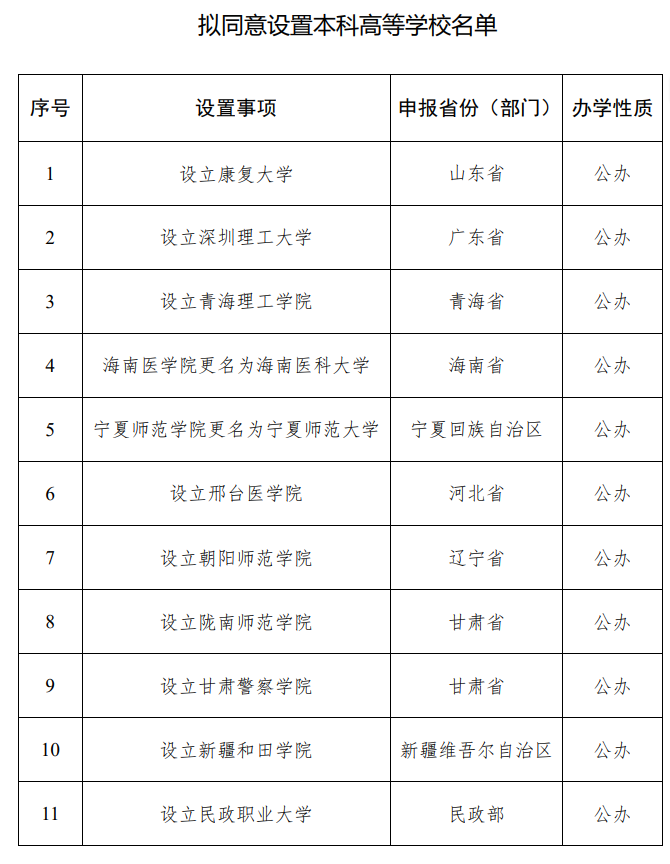 好博体育北京5月15日电 (记者李依环)教育部网站今天发布消息,根据高等教育法、《普通高等学校设置暂行条例》等有关规定以及第八届全国高等学校设置评议委员会考察评议结果,经教育部党组会议审议,拟同意设置康复大学等24所学校。其中,2所高校更名,21所高校为新设、1所高校为转设。