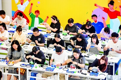 ——将颜料滴入水中,轻轻搅开,把扇子垂直浸入,入水时轻微旋转使纹路多变,之后将扇子垂直拎出、晾干……非遗漆扇课堂上,传统手艺吸引了众多学员参与。